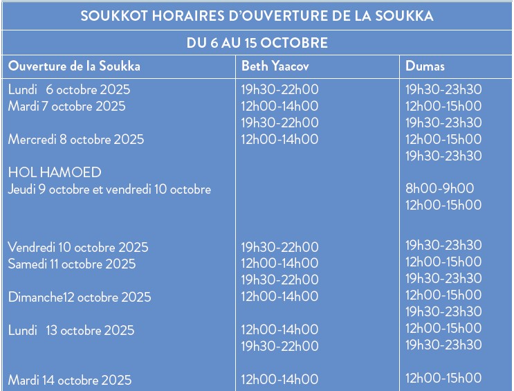 Horaire d’ouverture de la soukka- Beth Yaacov et Av.Dumas