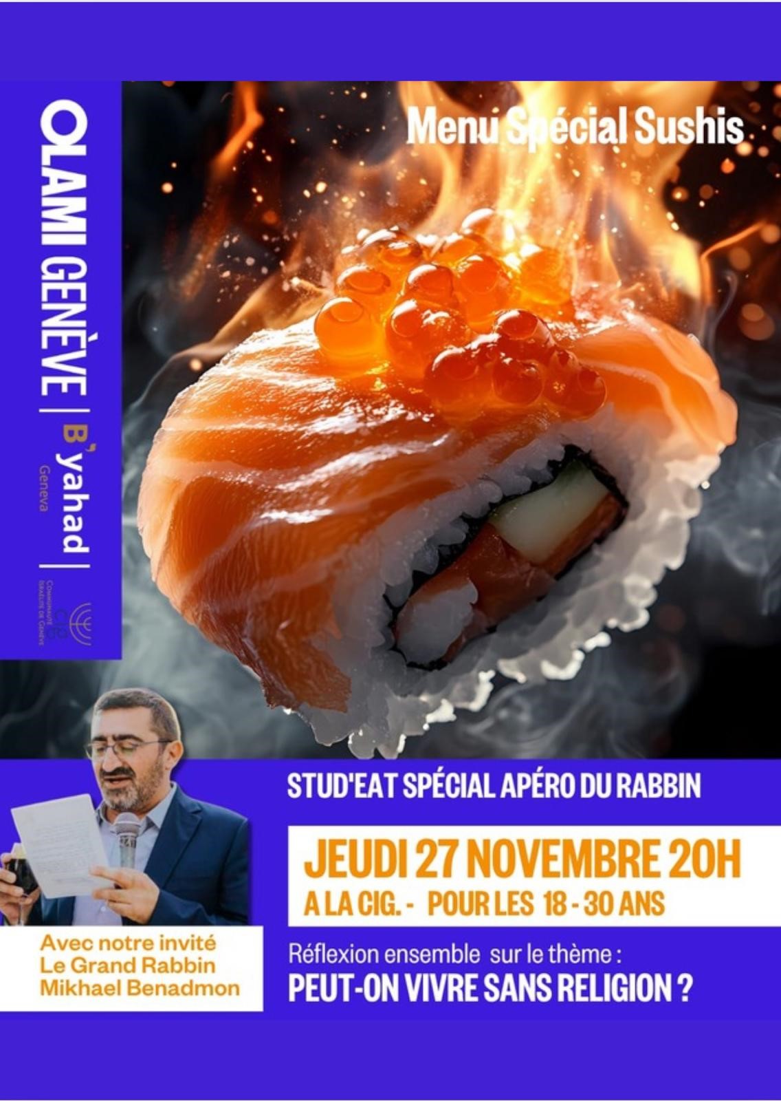B’yahad et Olami Genève vous invitent pour un moment unique autour d’un buffet de sushis et d’un échange inspirant avec le rabbin Mikhael Benadmon sur le sujet « Peut-on vivre sans religion ? »