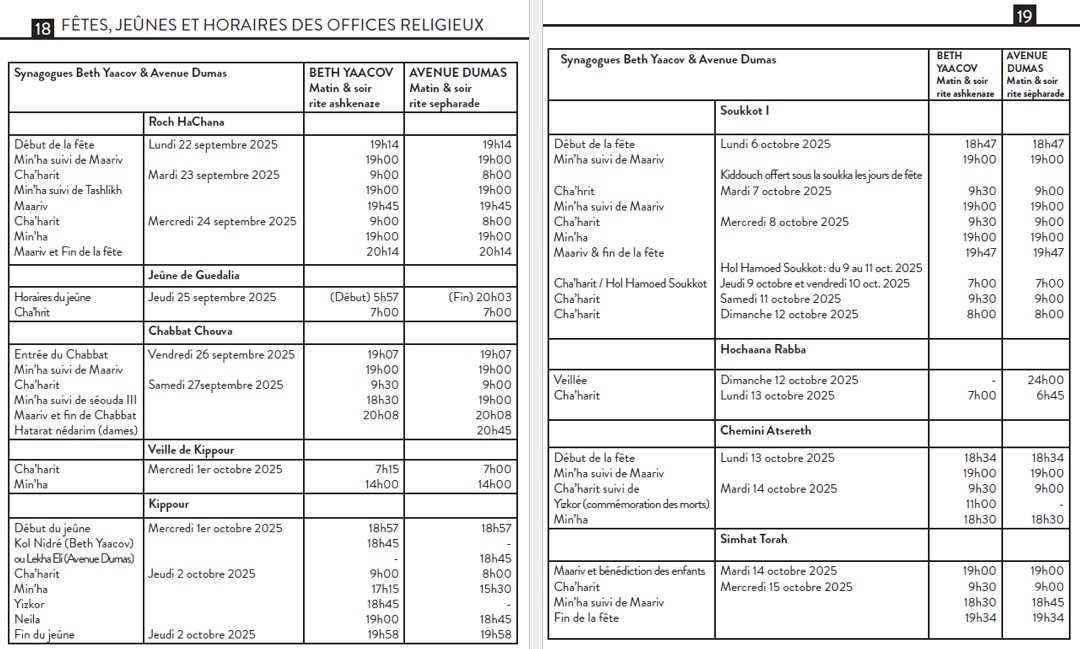 Vendredi soir (Min’ha) : 18h45 Chabbat matin : (Cha’hrit) 9h30 Min’ha : 18h30